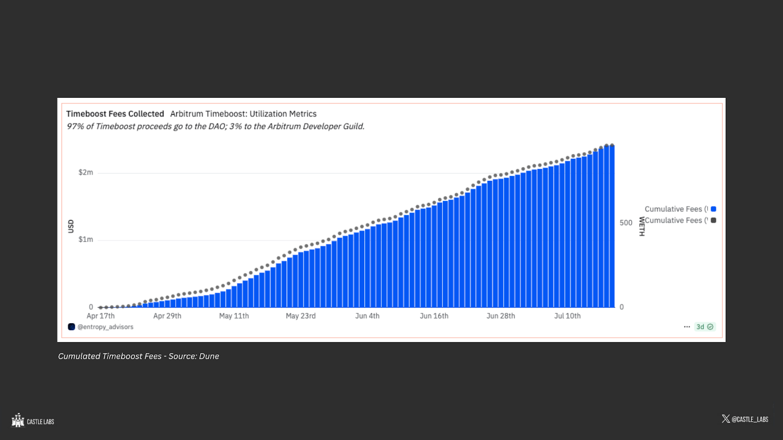 Timeboost: Arbitrum Timeboost is a transaction ordering policy that enables the chain to capture MEV and reduce spam across the network. Timeboost has cumulatively generated fees of approximately $2.4 million since its inception in April 2025, representing an increasing share of revenues for the Arbitrum DAO.
