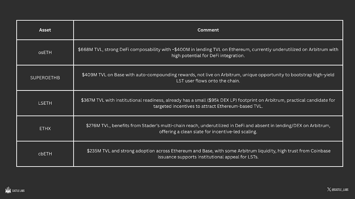 Liquid Staking assets are expanding across chains, and these assets are composable in the DeFi ecosystem. Leveraging the growth of these assets and incentivising them would be beneficial for Arbitrum, as it would contribute to chain liquidity and open newer streams for yield generation.