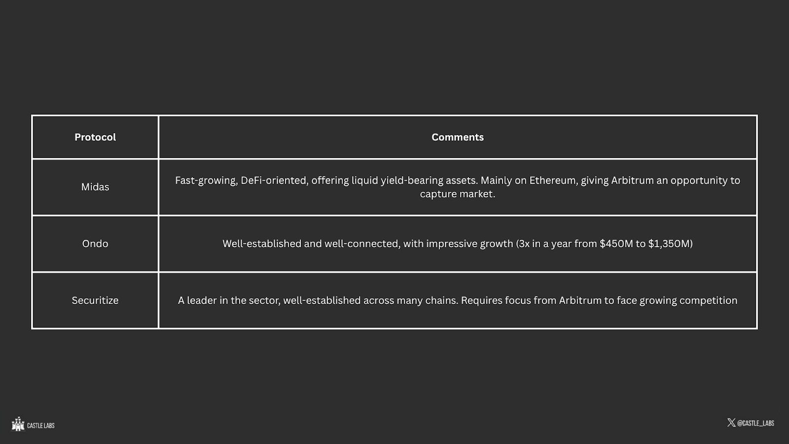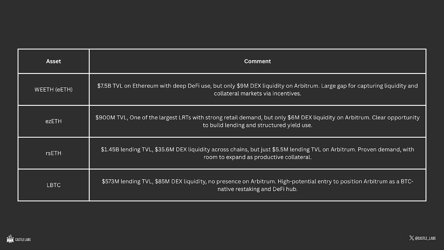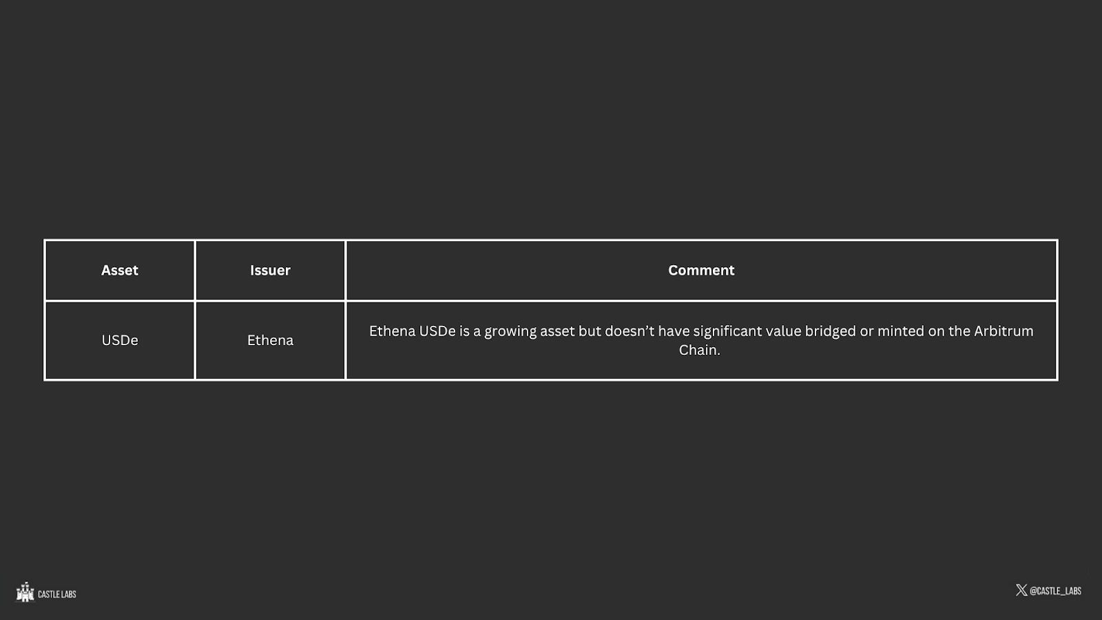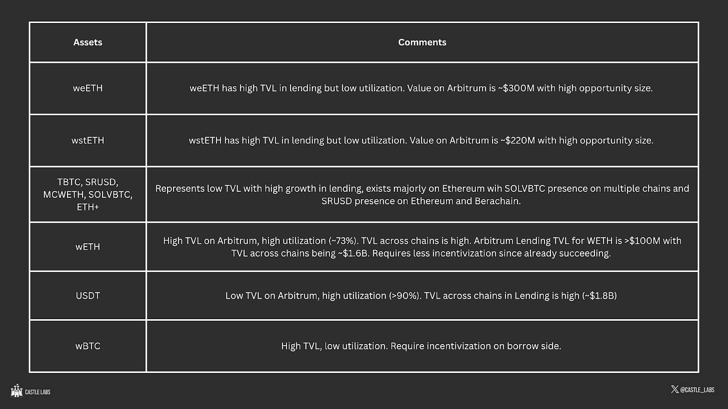 At the asset level, certain assets are growing on other chains but either don’t exist on Arbitrum or have low liquidity, and could be a potential opportunity to leverage, are also mentioned in a separate section named Asset Level Gaps.