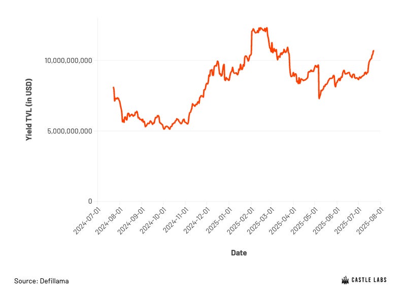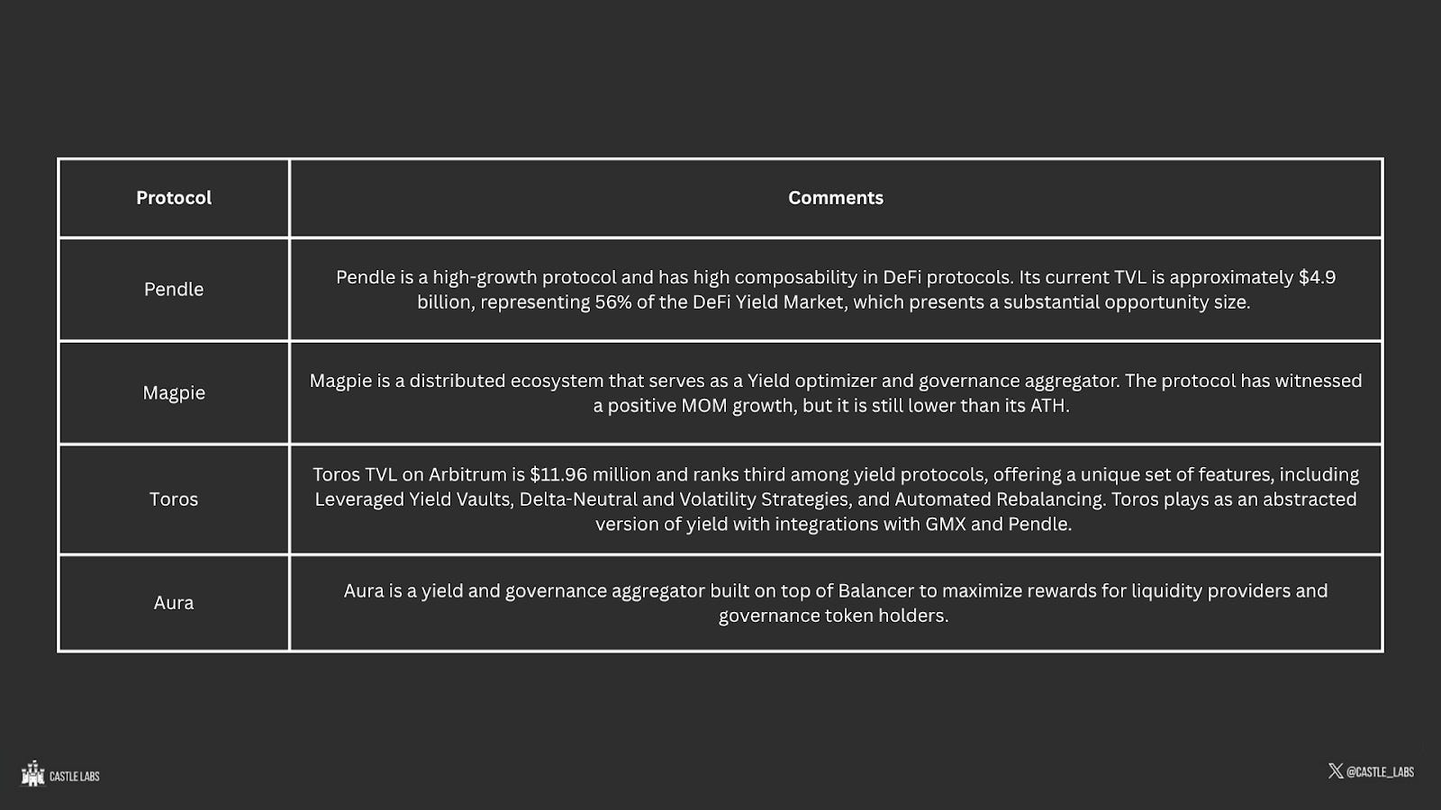 Yield as a category is growing, with the current TVL standing at $10.5 billion, contributed mainly by Pendle and Convex, which collectively represent ~68% of lending TVL. Most of the TVL is locked in Ethereum, followed by Solana and Arbitrum. The Arbitrum yield sector is currently growing with positive MOM growth, with protocols like Pendle, Magpie, Toros, and Aura.