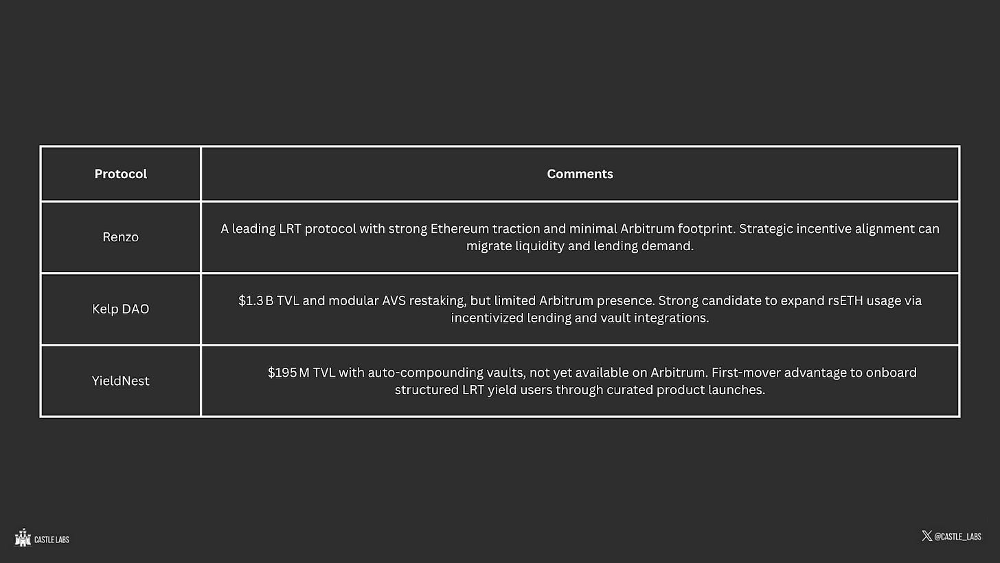 On the feature side, protocols like Yieldnest provide auto-compounding vaults that automate the aggregation of staking rewards, restaking rewards, and DeFi yields into a single, easy-to-use asset. These types of structured products are currently not live on Arbitrum, representing a clear gap in user-friendly LRT yield products on the network.