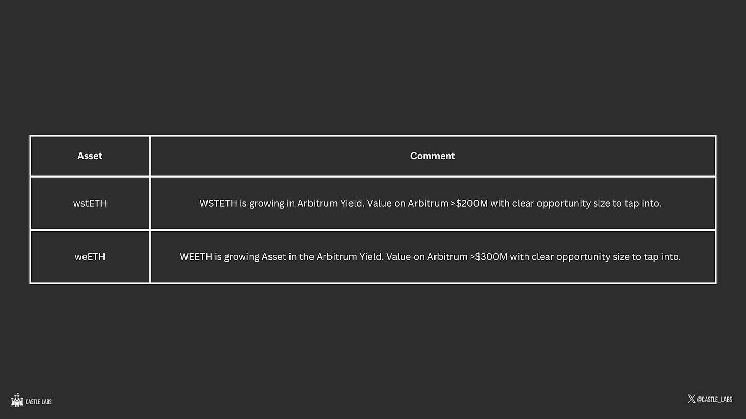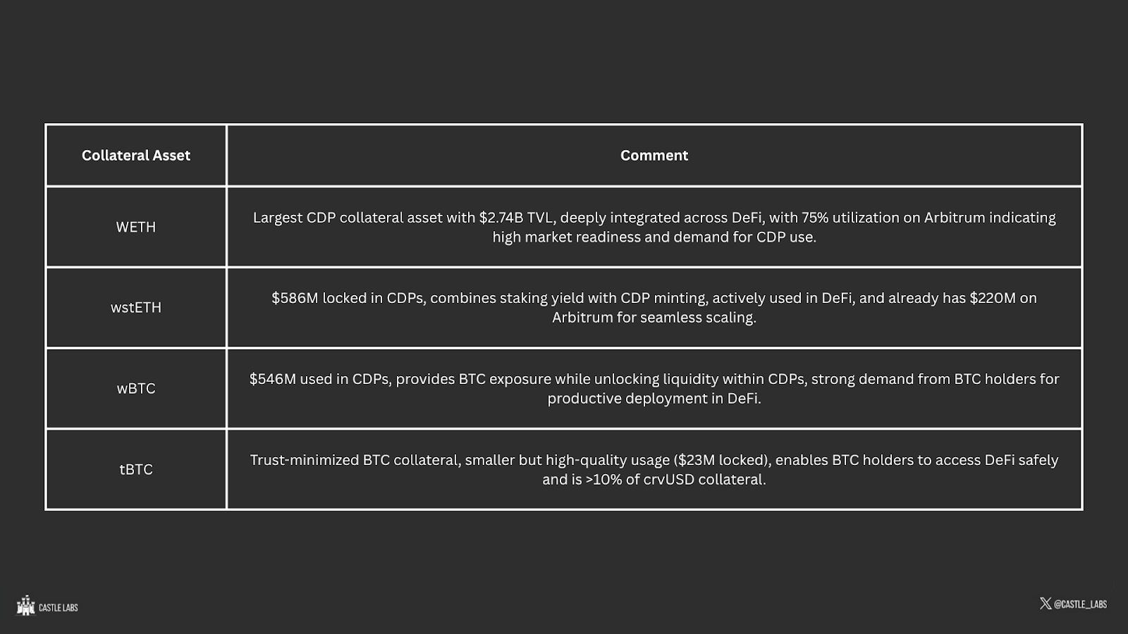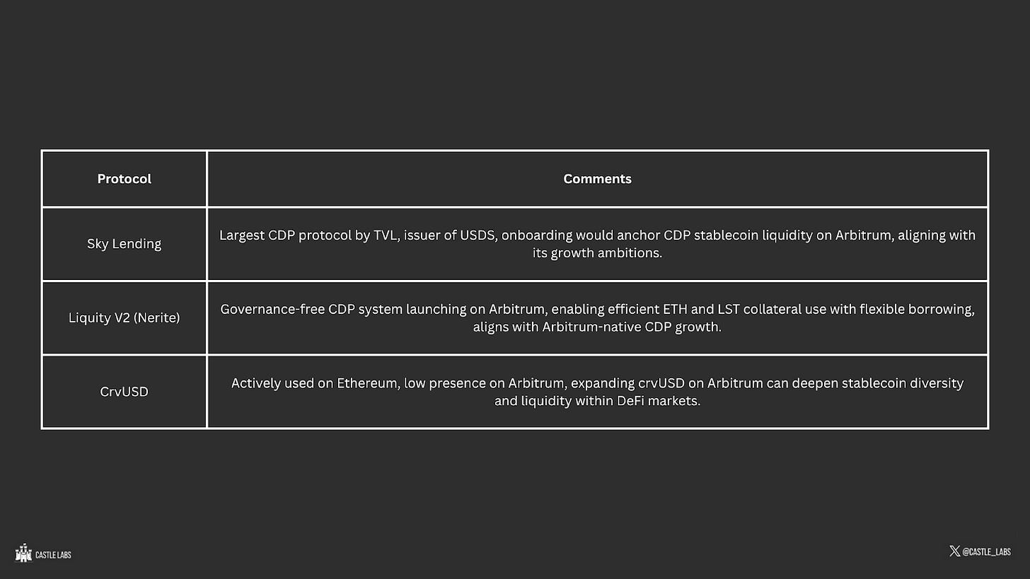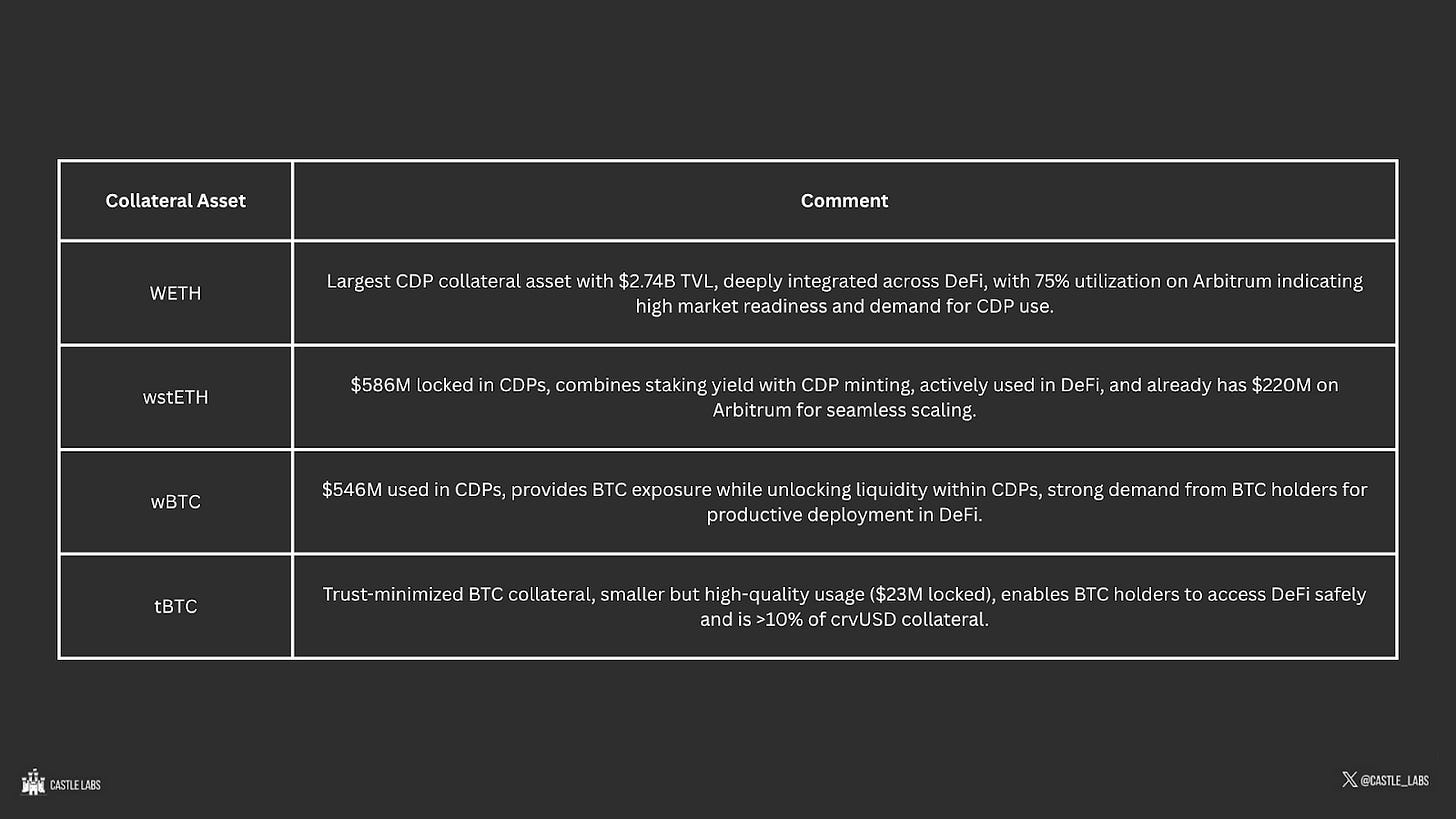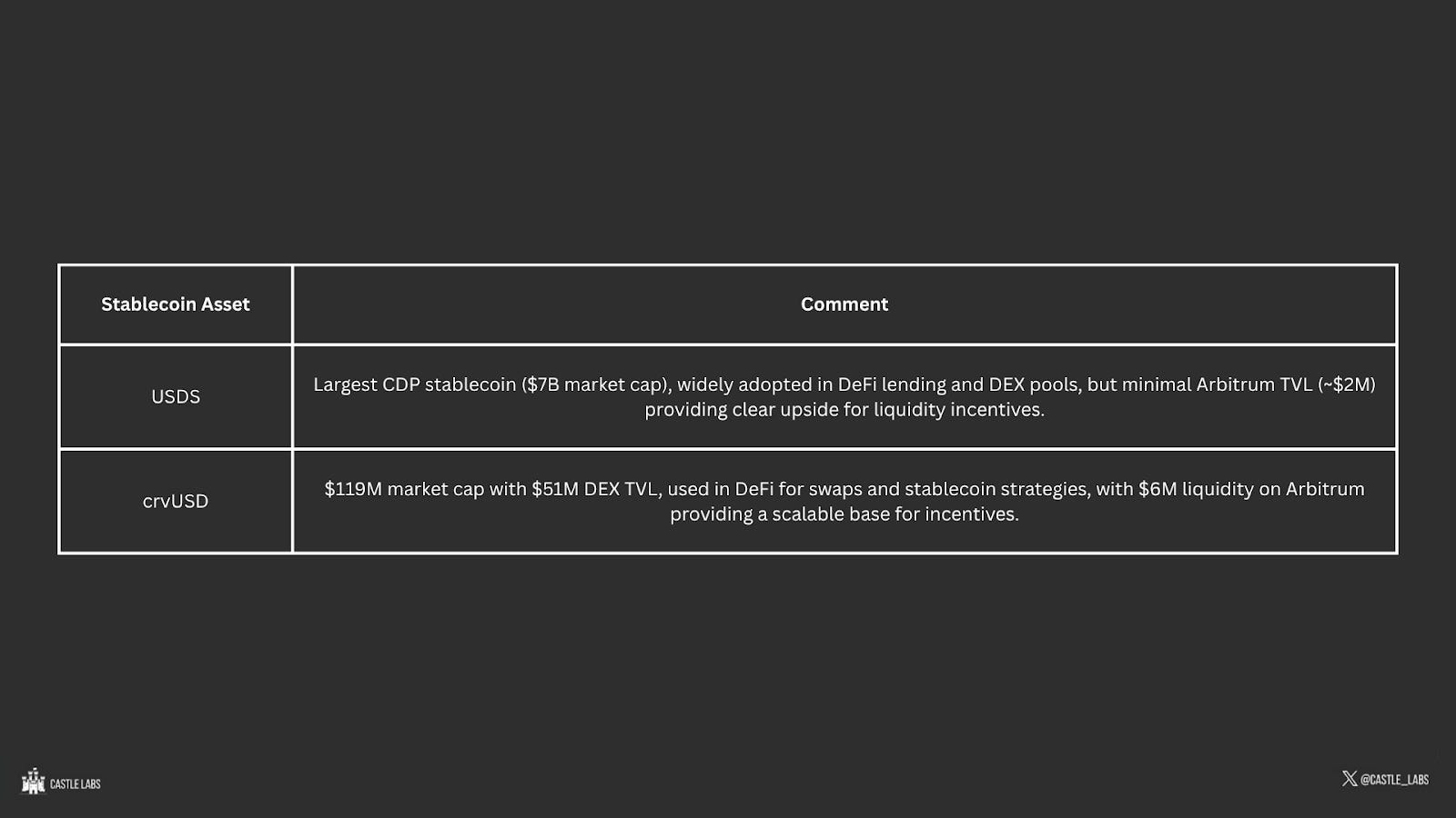 The Arbitrum CDP sector is currently small but growing, with native deployments like Nerite, a friendly fork of Liquity V2. The TVL on these protocols are currently low and can be incentivised. Furthermore, these assets are presently limited in scale for DeFi usage given their low TVL.