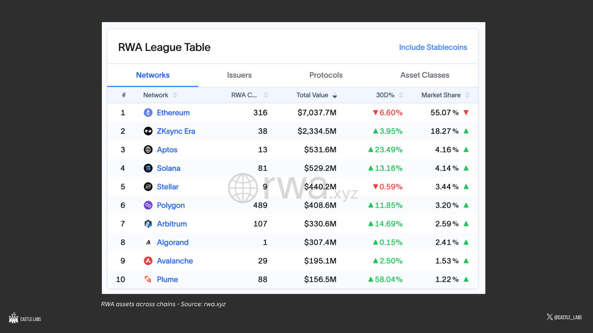 Arbitrum represents a smaller market share in RWA, accounting for only 1.3% of the market, with a TVL of $342 million. Spiko and Franklin Templeton represent 70% of the Arbitrum RWA market, with Securitise and Ondo showing relatively less growth.