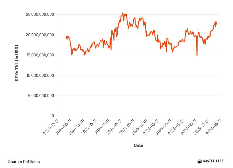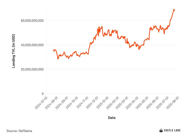 Lending is one of the largest categories, with a current TVL of $69.53 billion, with Aave representing 48.2% of the total TVL. Beyond Aave, there is a very healthy competition in terms of TVL among protocols like Morpho, Sparklend, Euler, and others, with a great opportunity for growth.
