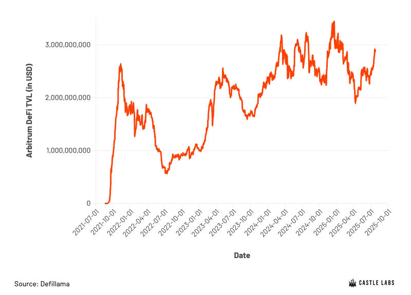 Liquidity: Arbitrum's DeFi TVL is currently approximately $2.9 billion, with the majority of value locked in Aave, GMX, and Uniswap, representing 64% of the total TVL.