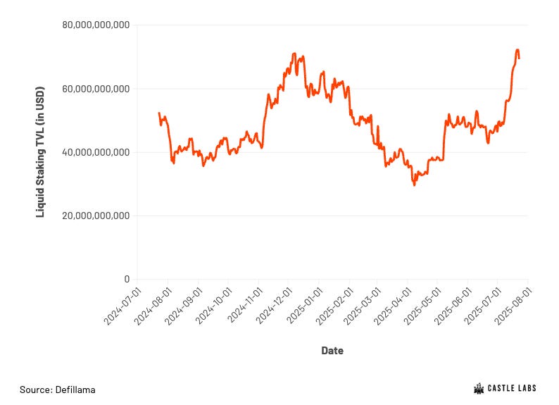 Liquid staking is one of the largest categories in DeFi, with Lido being the major contributor, and its TVL stands at $66.8 billion. On a chain basis, it is led by Ethereum, followed by Solana, which together account for ~90% of the market share. These assets are present across different chains, with the majority of them being on the L1, Ethereum, with other chains representing a smaller share of the liquid staking tokens bridged.