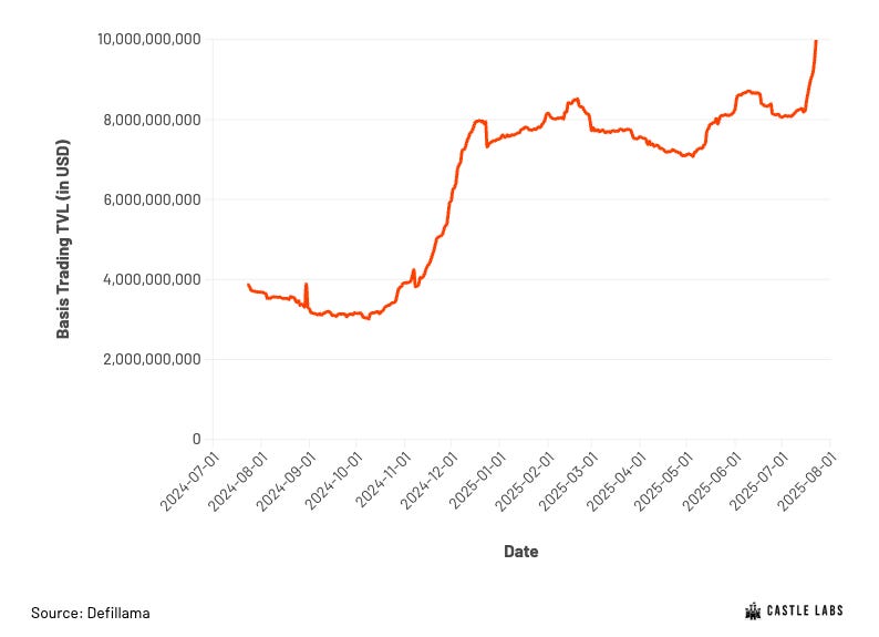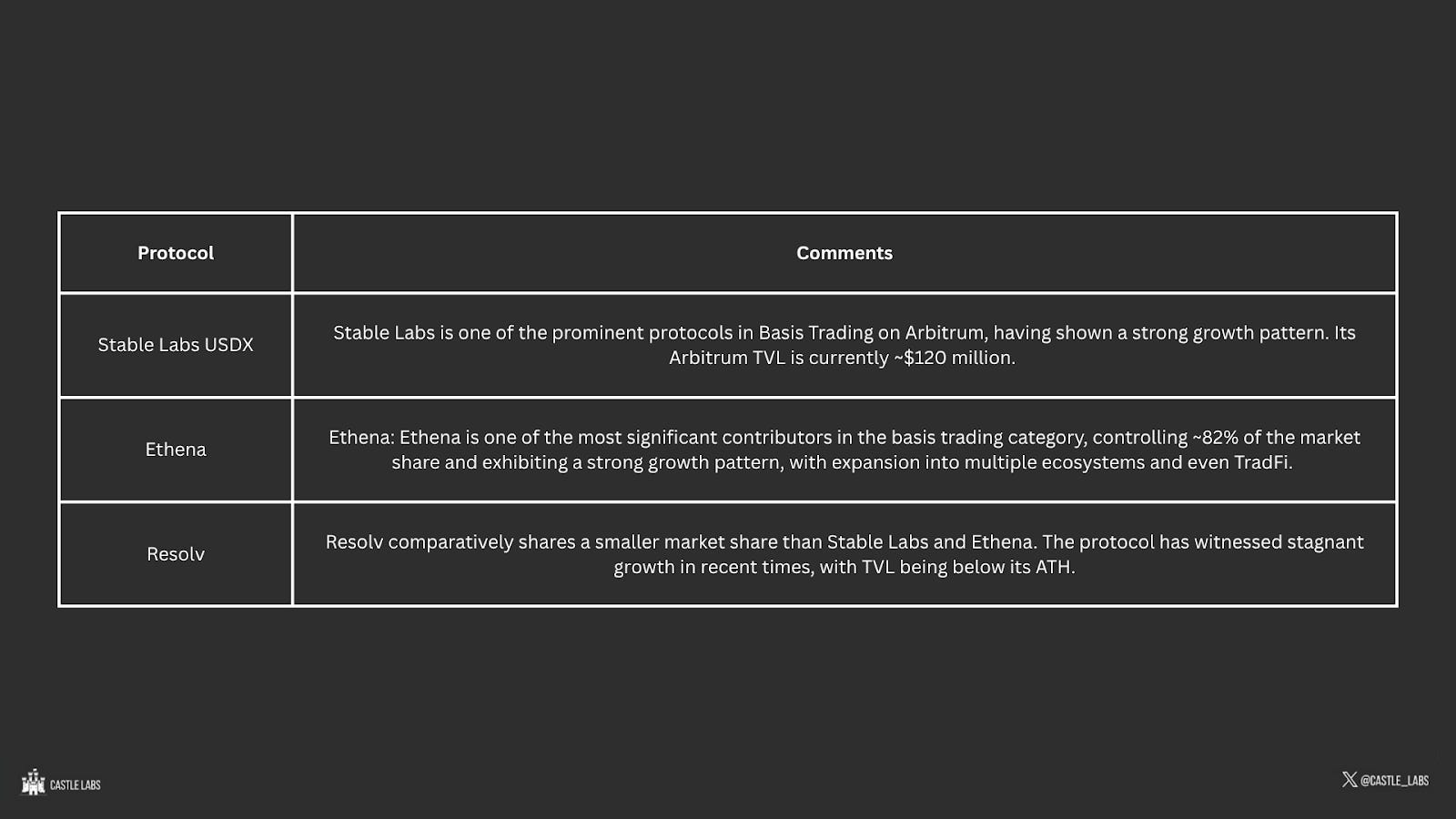 Basis Trading's current TVL is approximately $9 billion, with Ethena being the major contributor, representing more than 80% of the market. Most of the Basis Trading TVL is tied to Ethereum, and Arbitrum shares a low market share with the major protocol deployed being Stable Labs, which is currently at a TVL of $118 million, experiencing stagnant growth.