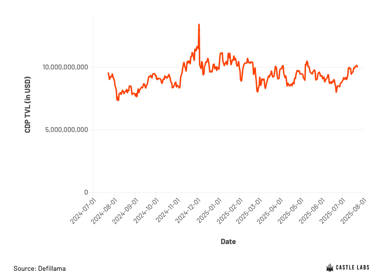 CDP TVL is $10 billion, with major protocols including Sky Lending and Lista, which together represent 68% of the market share. CDP TVL experienced a surge during the previous cycle but has stabilised around its current value since late 2022. Most CDP protocols are concentrated on Ethereum, followed by BSC. On Arbitrum, there is no major CDP protocol, and the sector as a whole has a current TVL of $26 million. The new launch of Nerite (Liquity multi-chain deployment) has increased the chances of growth of CDPs within the Arbitrum ecosystem.