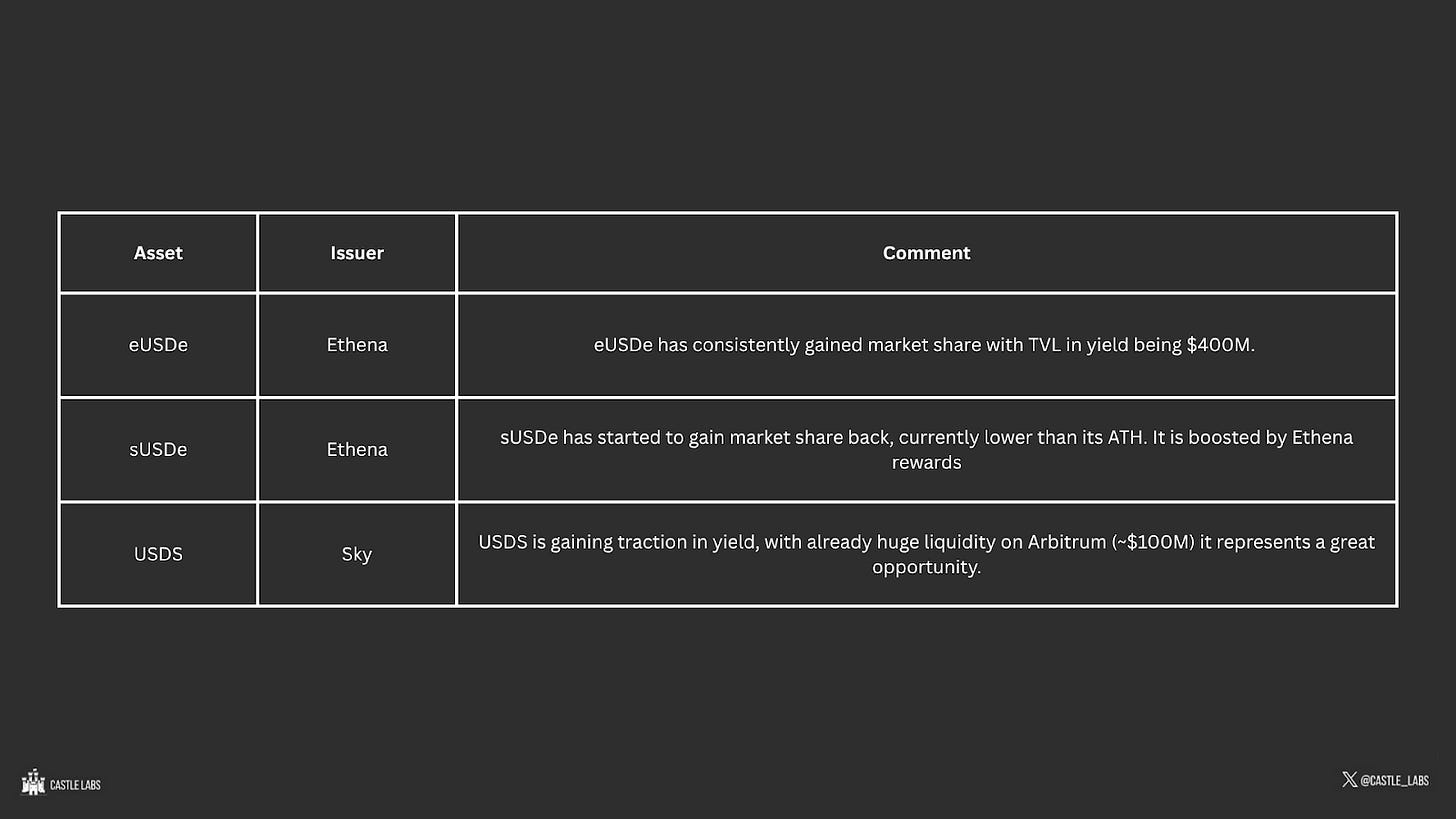 We can also examine prominent developments in protocols like Ethena, which is building its ecosystem through Ethereal and Derive, where Ethena serves as the primary liquidity provider through its assets, such as USDe and ENA. In particular, they are focused on creating their network to create better infrastructure for their products through the Converge chain, which is in collaboration with Arbitrum. Given the already established relationship with Ethena, incentivising and onboarding its assets on Arbitrum will be beneficial, improving liquidity and yield opportunities.