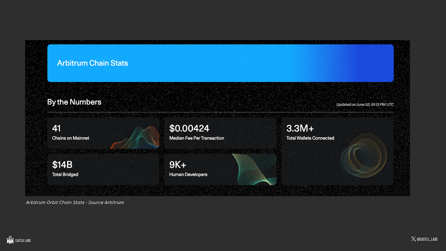 Arbitrum Orbit: Arbitrum Orbit is experiencing rapid growth following recent announcements of deployments from Ethena and Robinhood. The Arbitrum Stack is developer-centric, easing the process of deploying an L2 or L3. There are currently 41 chains live on the mainnet, with over 100 in the pipeline across DeFi, RWAs, Gaming, NFTs, AI, DePIN & more.