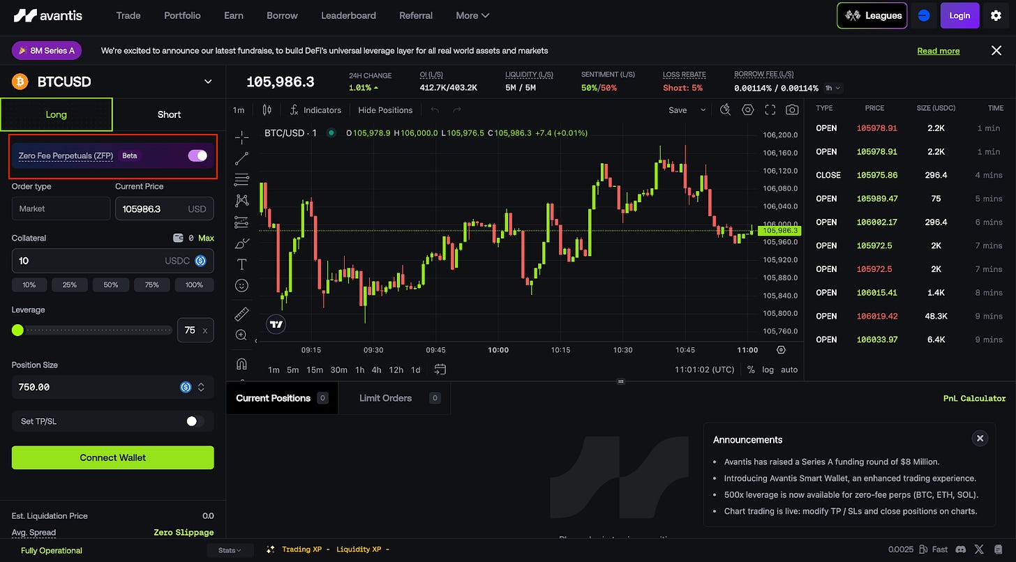 Avantis addresses this by utilizing a synthetic virtual AMM (vAMM) architecture for select markets, such as BTC. This design enables execution at the oracle price, with no spread or price impact, regardless of order size. Whether trading $100 or $1 million, the user receives the same price. Unlike traditional AMMs or order books, where larger trades consume liquidity and create slippage, the vAMM model bypasses this by referencing oracle prices and routing exposure through its vault infrastructure.