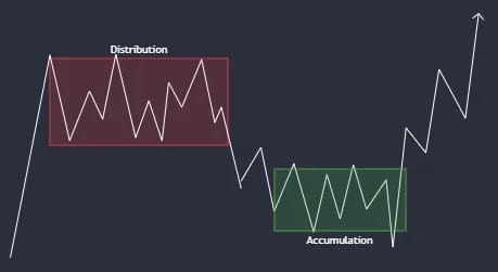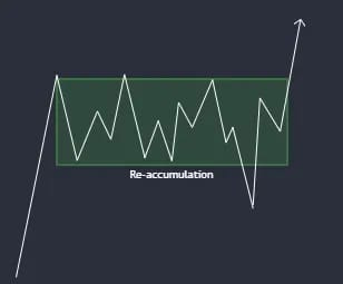 If this candle continues lower, however, that will mean that the most recent sideways price action was a local distribution. The expectation here would be for price to break down and find some equilibrium again - an area of equal supply and demand, resulting in price going sideways. Here, for overall re-accumulation, we’d expect demand to overpower supply and price to break out higher, confirming an accumulation and trend continuation.